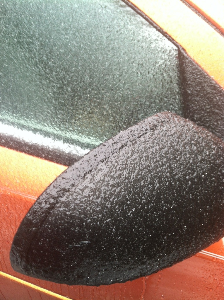 The next morning I woke up to ice hitting my window. Here we go… I got up and peeked through the window and to my surprise the parking lot was covered in ice. Wow. And the ice was still steadily coming down.