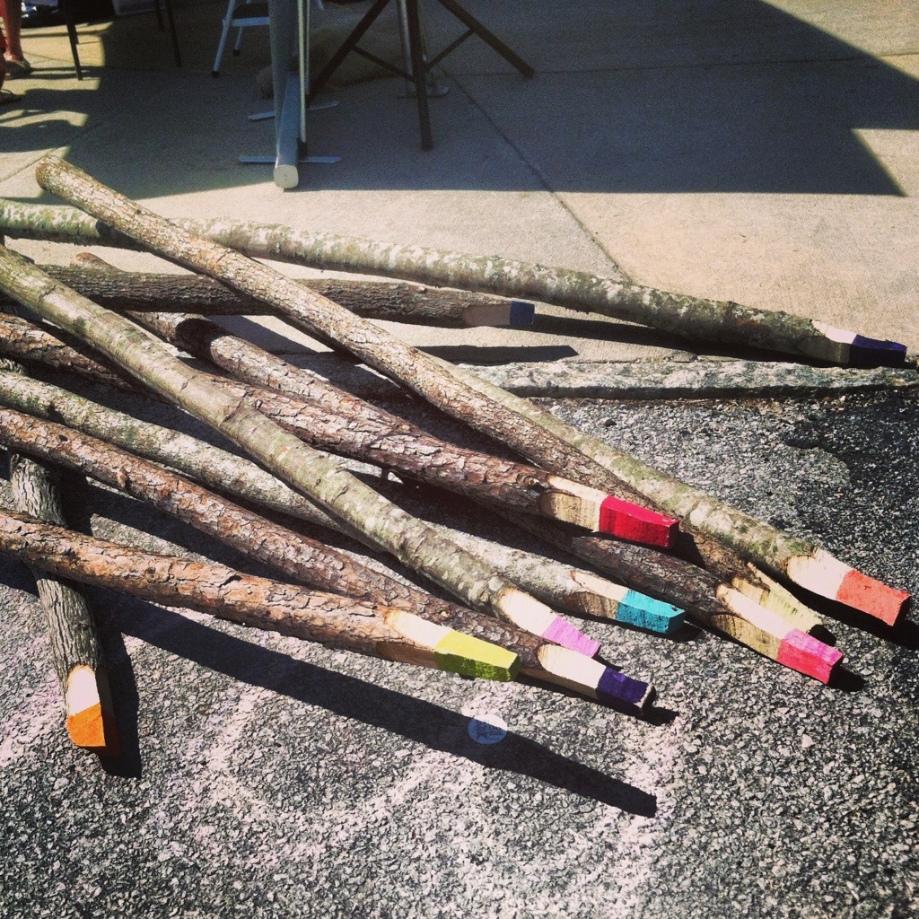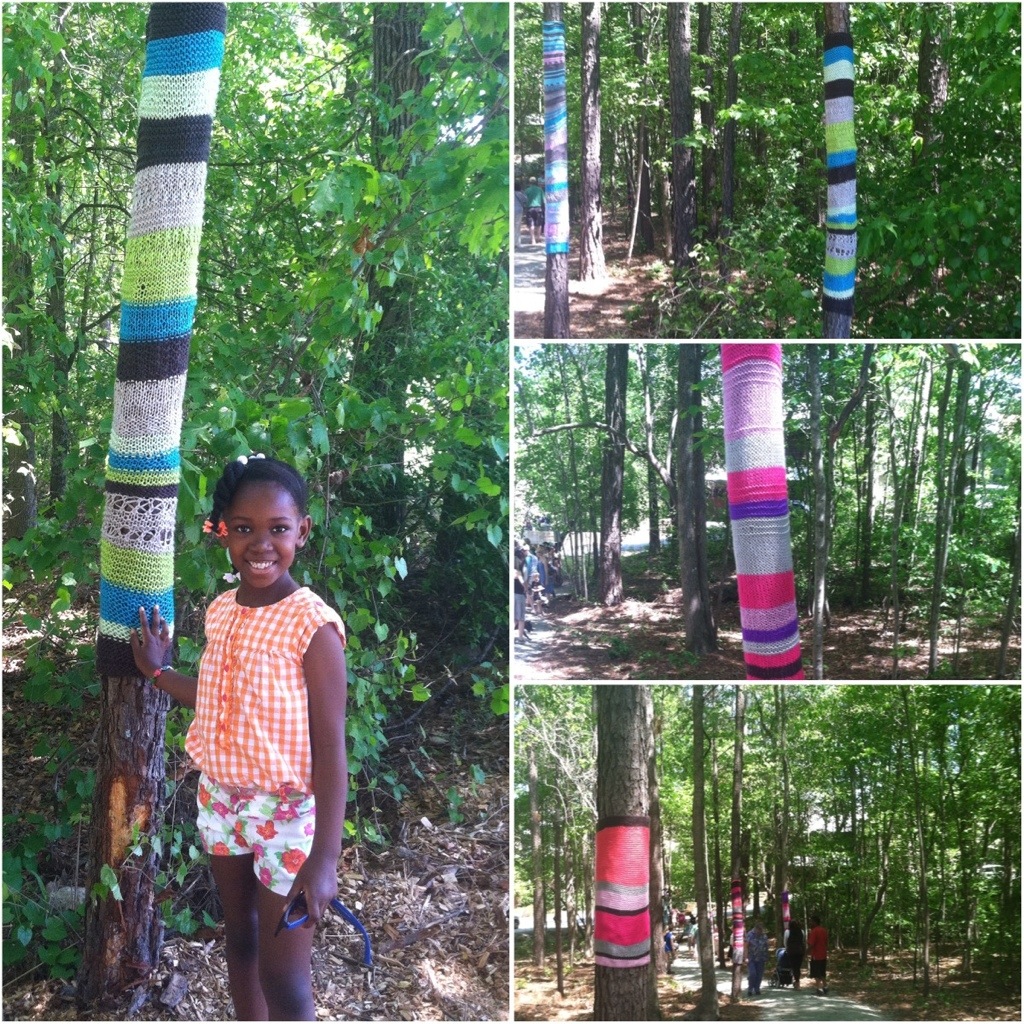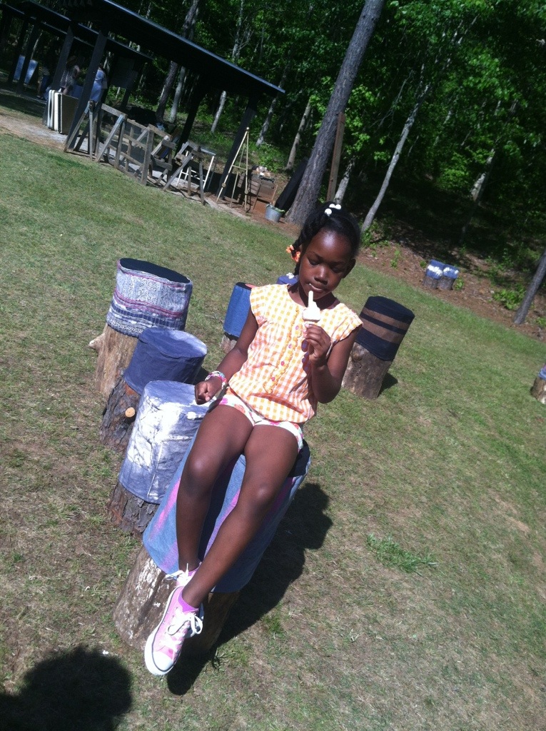 Too busy eating her Pear Cinnamon pop from King of Pops! Check out the awesome denim stump covers.
