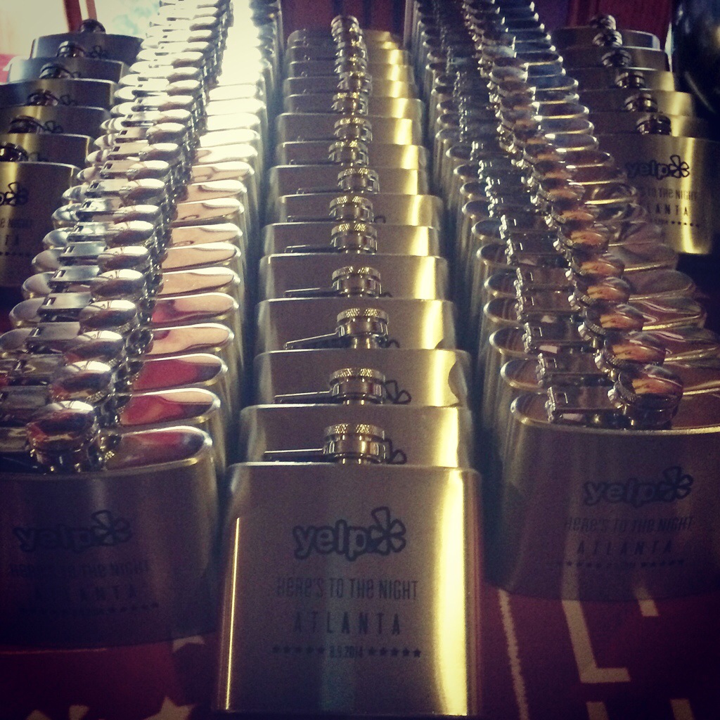 The event started promptly at 7:00. As the doors open, the anticipation grew. At the top of the front step was a table were you could donate to The Atlanta Foundation for Public Spaces and Georgia Lawyers for the Arts. Of course I did my part and donated. Upon doing so I was given a ticket and was led to a room. This room was filled with all kinds of yelp swag! You were given a reusable Yelp bag and let the bag filling begin! There was sunglasses, buttons, shot glasses, coozies, flasks, wrist bands, and mints to name a few.