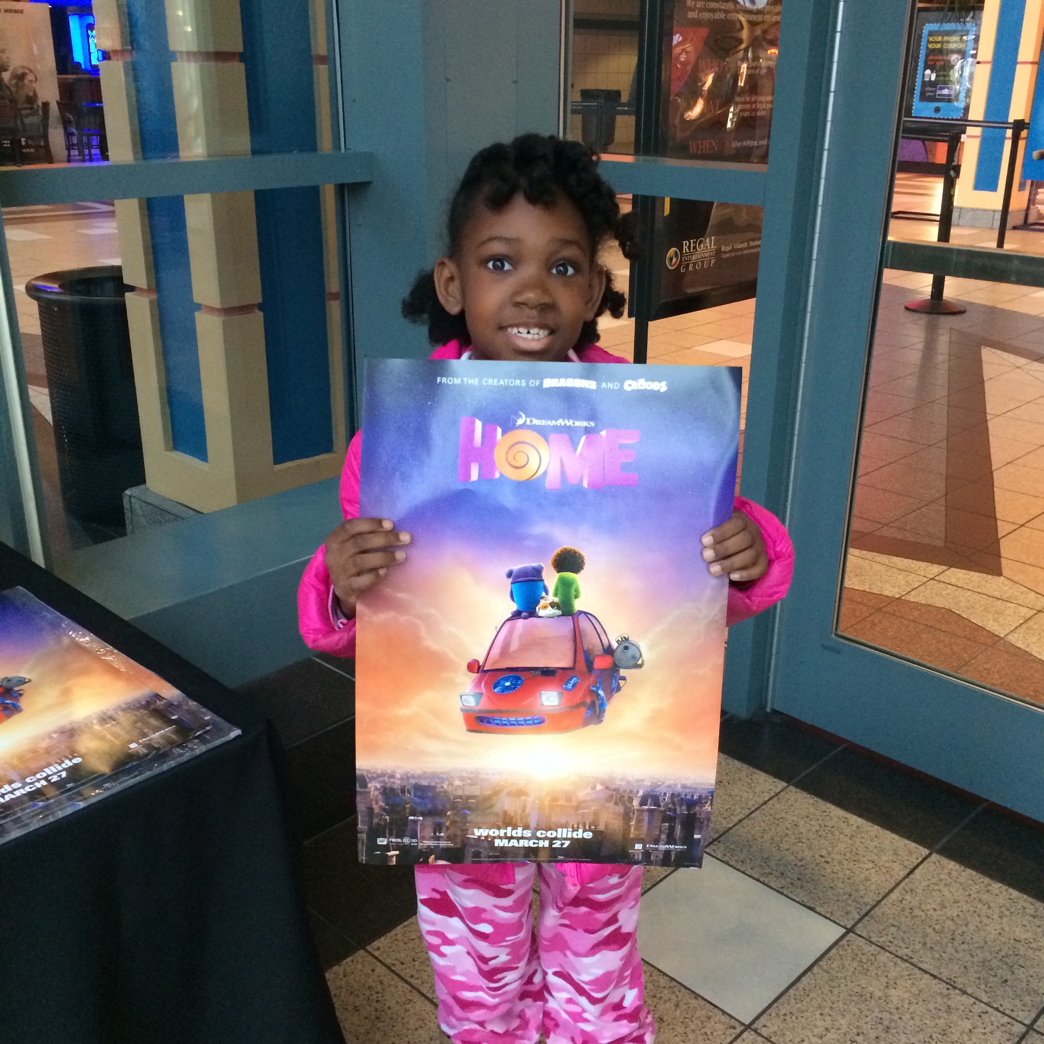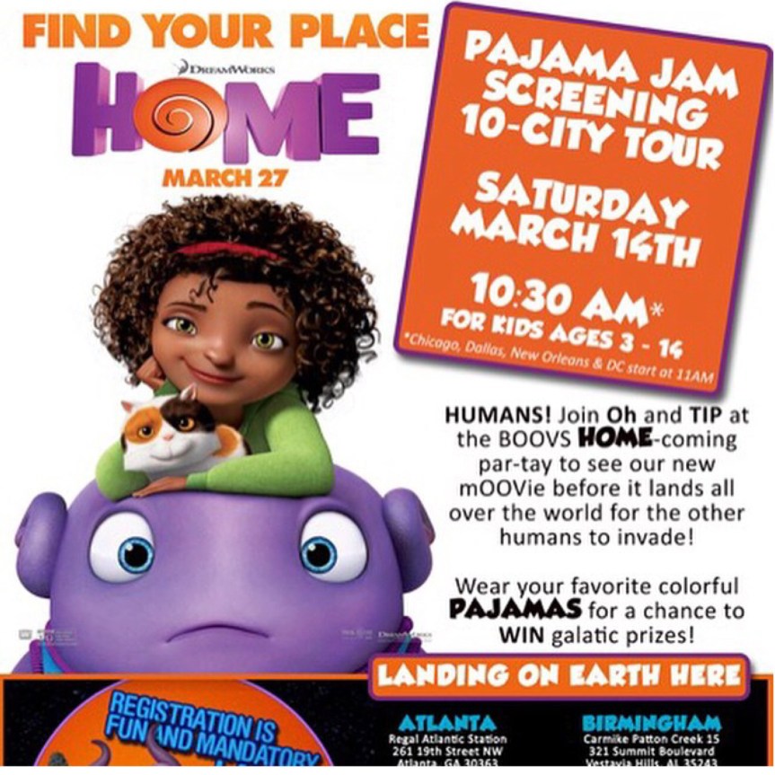 This morning me and the Mini Me got up and headed to Atlantic Station for the special advance screening of Home. Home is the story of a girl separated from her mother during an alien invasion of Earth. It stars Rihanna, Jennifer Lopez, Steve Martin, and Jim Parsons. I really enjoyed this movie! I laughed, I cried (one tear), and I cheered the character on. It is a great family movie! The screening was also a pajama party. Yay! So of course I was asked to wear my pink onesie. So I did. And since I did I was one of 7 parents that was able to get a bag of prizes for doing so. It’s great to see parents not afraid to have a bit of fun with their kids. We had a grand time. Home will be in theaters March 27th. GO SEE IT!!