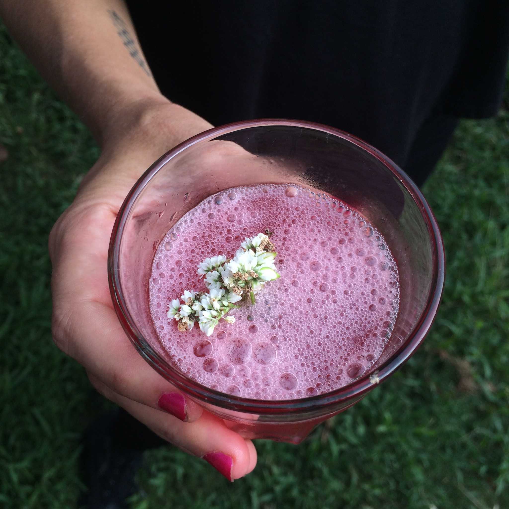 Flower Hustle | Ford’s Gin, Blackberry, Cardamon, Citrus, Sparkling Blanc de Blanc garnished with Buckwheat Flowers