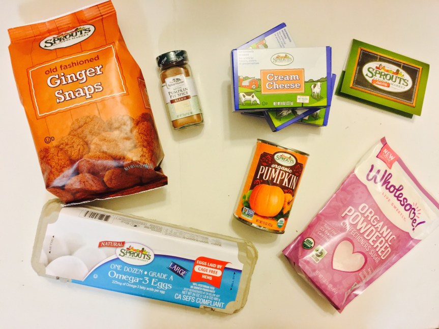 With plan in head, I proceeded to gather the ingredients for my Pumpkin Cheesecake Bars. And to put some pow wow on it, let’s top them with some Bourbon Whipped Cream. So very quickly I picked up some Sprouts Cream Cheese, Sprouts Ginger Snaps, Sprouts Eggs, Sprouts Organic Canned Pumpkin, and Sprouts Organic Whipped Cream. I also grabbed some Pumpkin Spice by The Spice Hunter, and some bulk pecan halves. With everything I needed plus a little more, I headed to the checkout.