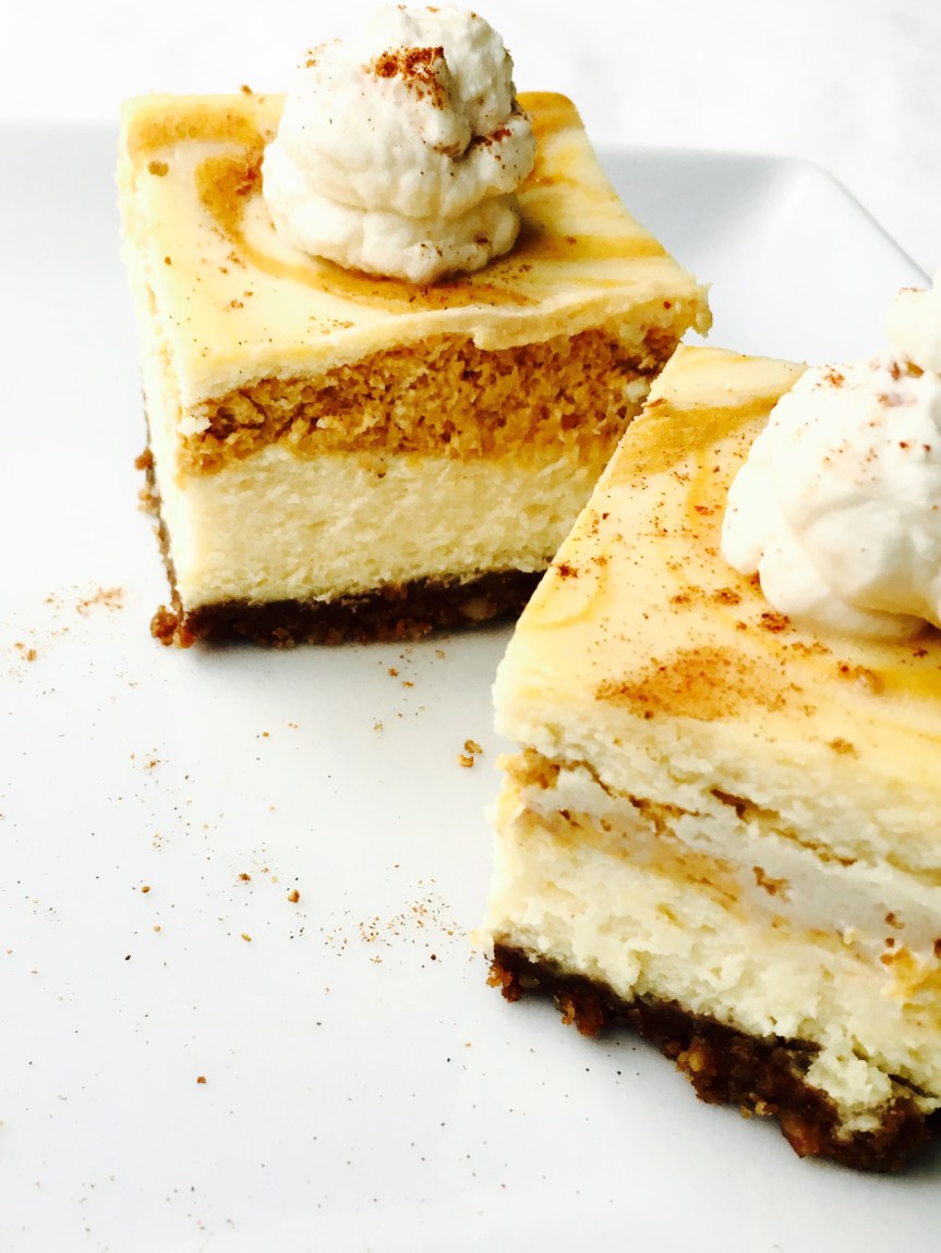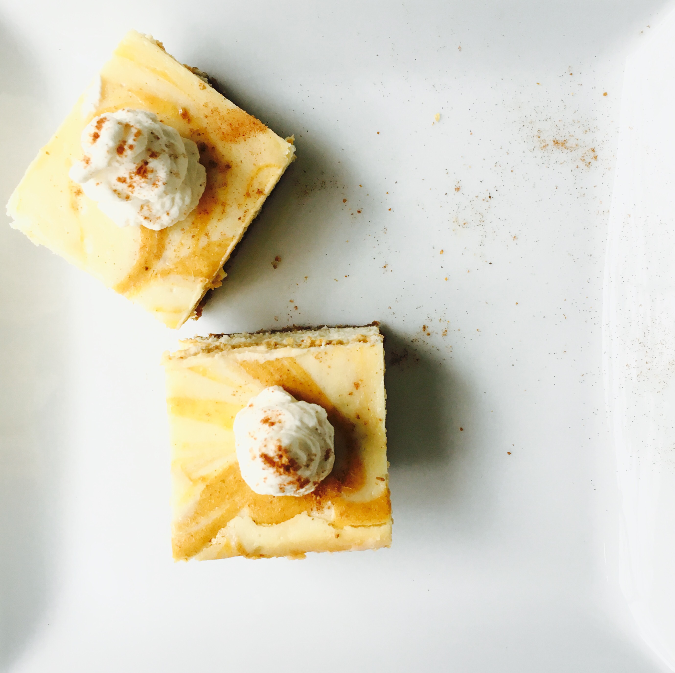 Spiced Pumpkin Pie Cheesecake Squares Topped with Bourbon Whipped Cream