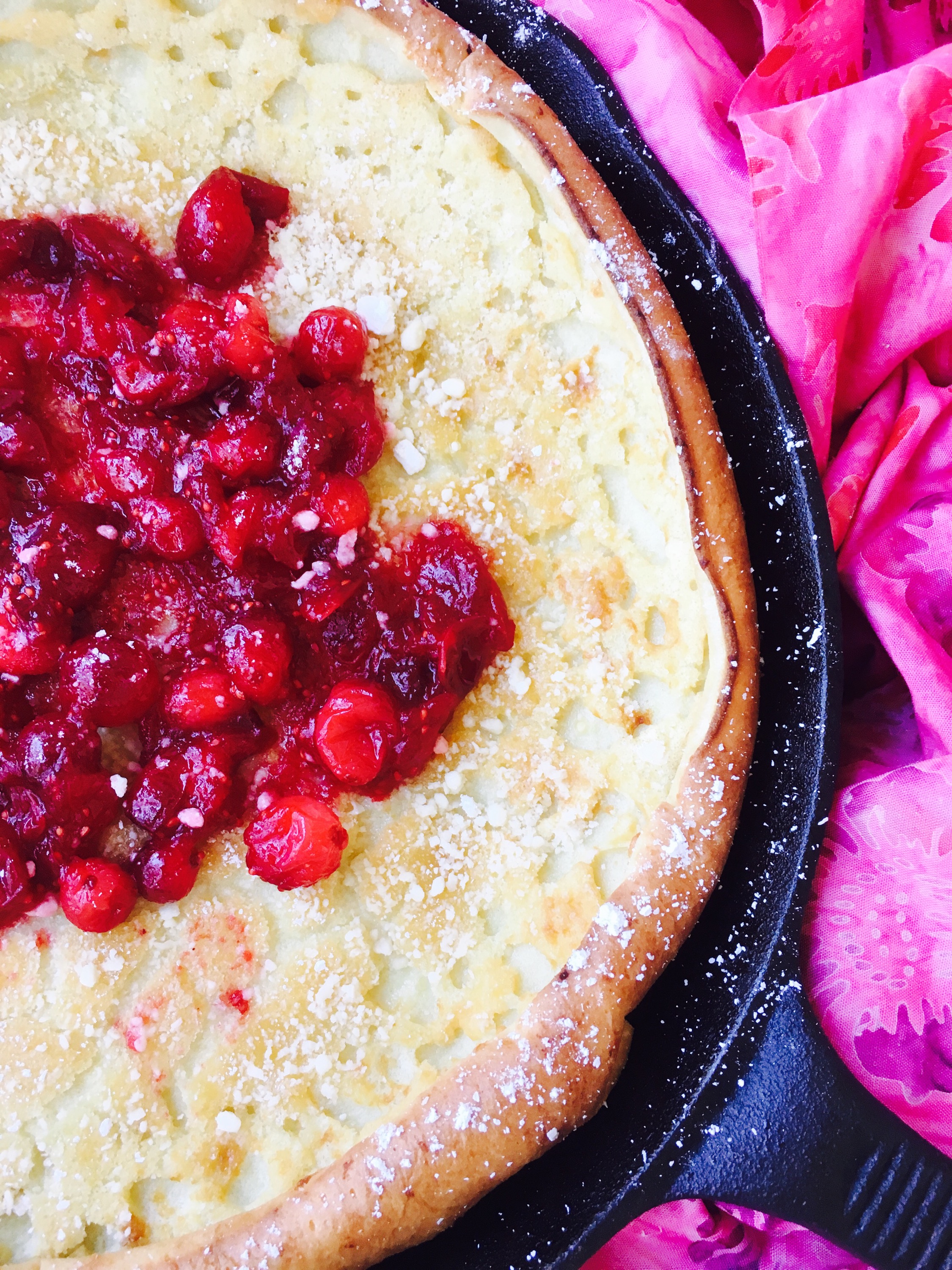 7. Remove pancake from oven. It will be beautiful and puffy. Put some of the cranberries in the middle and dust with powdered sugar.