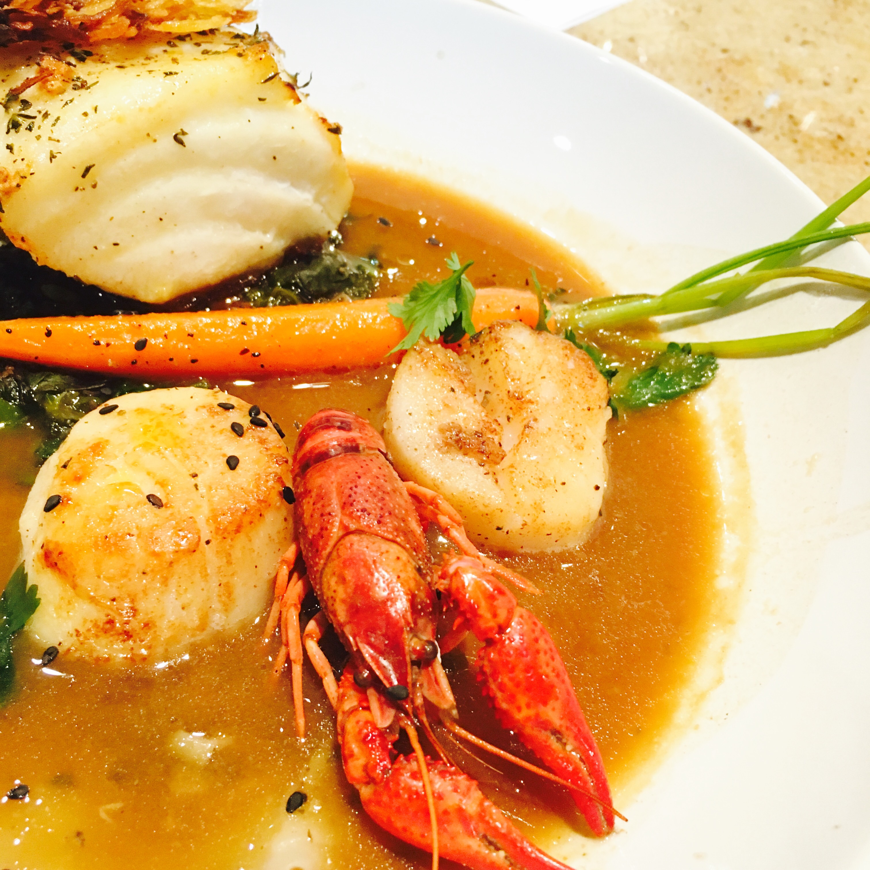 Yucca and Potato Encrusted Chilean Sea Bass with a Wild Mushroom Wontons in a Miso Broth with Seared Sea Scallops, Turned Carrots and Sesame Sautéed Field Greens Flanked by a Whole Roasted Crawfish Finished with a Drizzle of Garlic Olive Oil