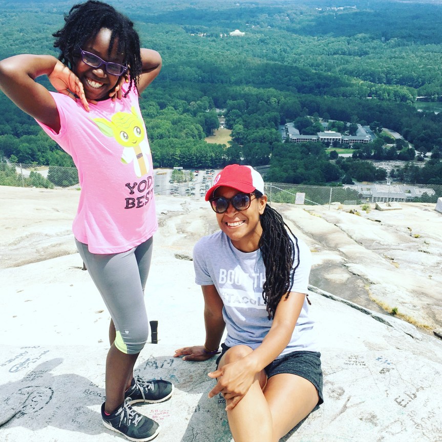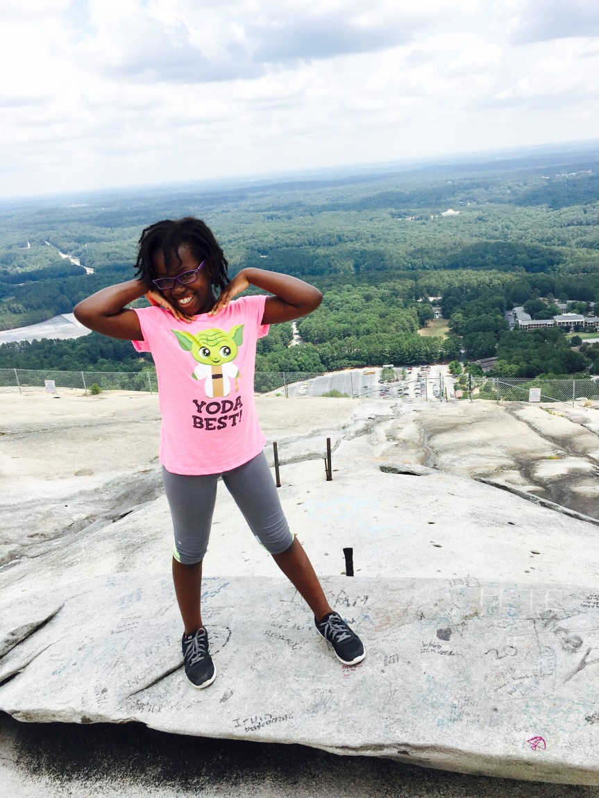 I’ve lived in Atlanta for over 20 years and have been to Stone Mountain Park several times for festivals and events. What I’ve have never done is actually climb to the top of Stone Mountain. Back in 2005 when I was training for the Peachtree Road race, I even ran around the perimeter of stone mountain but never up stone mountain. So when a friend of mine mentioned that her and her niece made it a summer activity to climb stone mountain a couple times out of the week, I thought it would be a perfect opportunity for Sage and I to tackle Stone Mountain. So we scheduled a time for us to meet up and on last Tuesday we took on the challenge of climbing to the top of Stone Mountain!