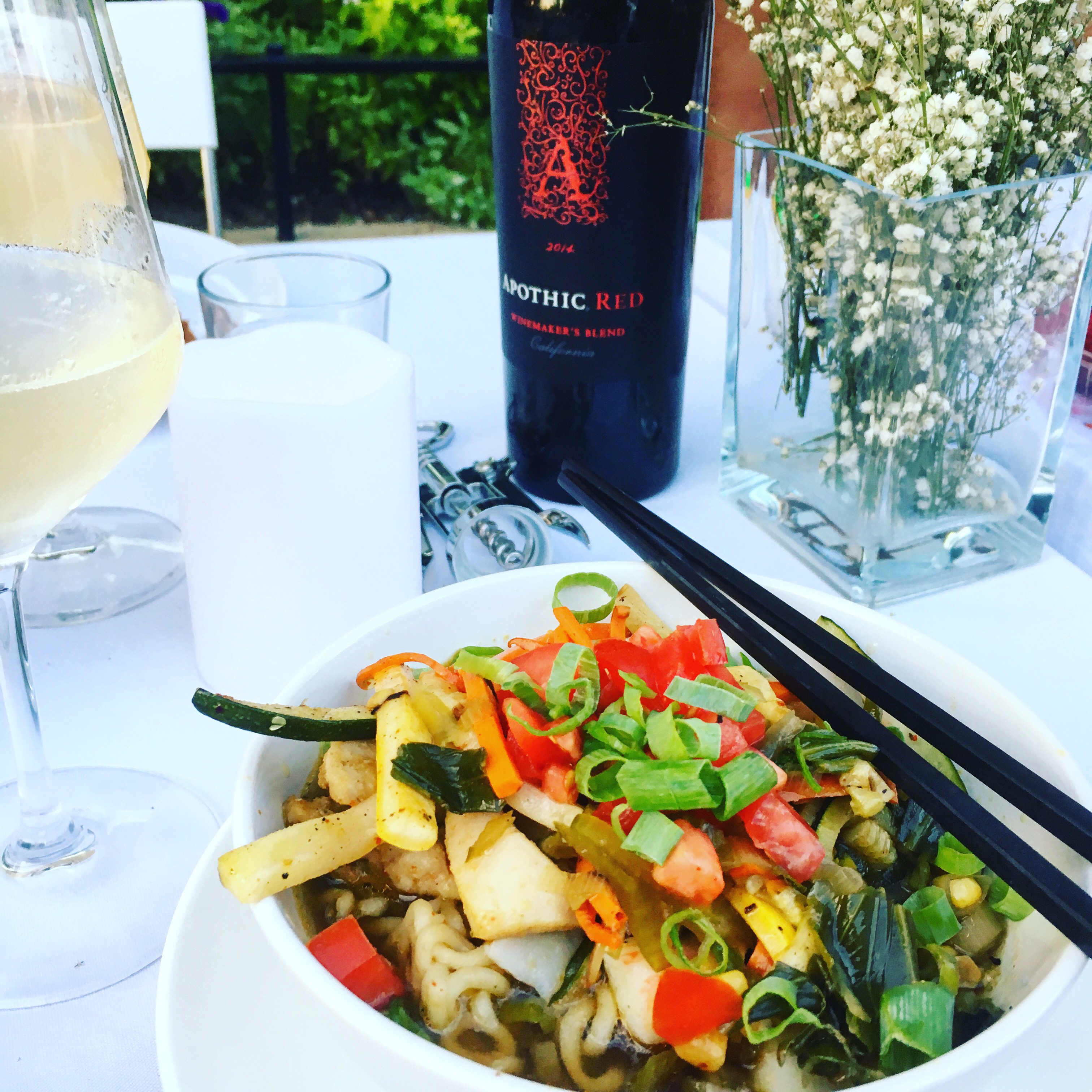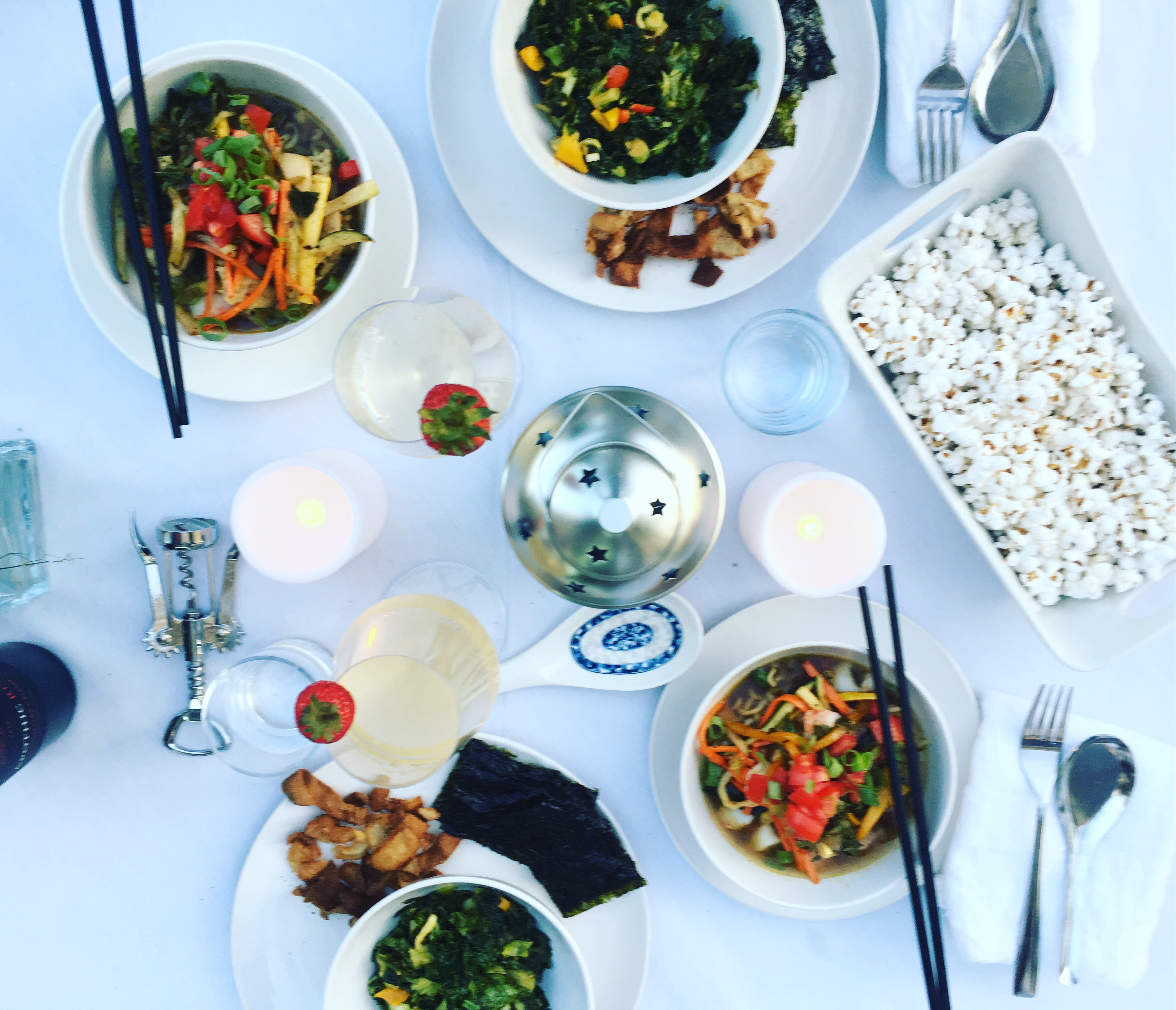 We decided that we would go Vietnamese with our meal and make Pho. Leslie made this fantastic lemongrass broth. We then added carrots, squash and coconut chicken to it. So good. We also had a marinated kale salad made by Leslie’s daughter, Din. It was delicious! Instead of bread, we went with popcorn seasoned with rosemary salt. I made a gluten free chocolate cake to end the meal on yummy note.