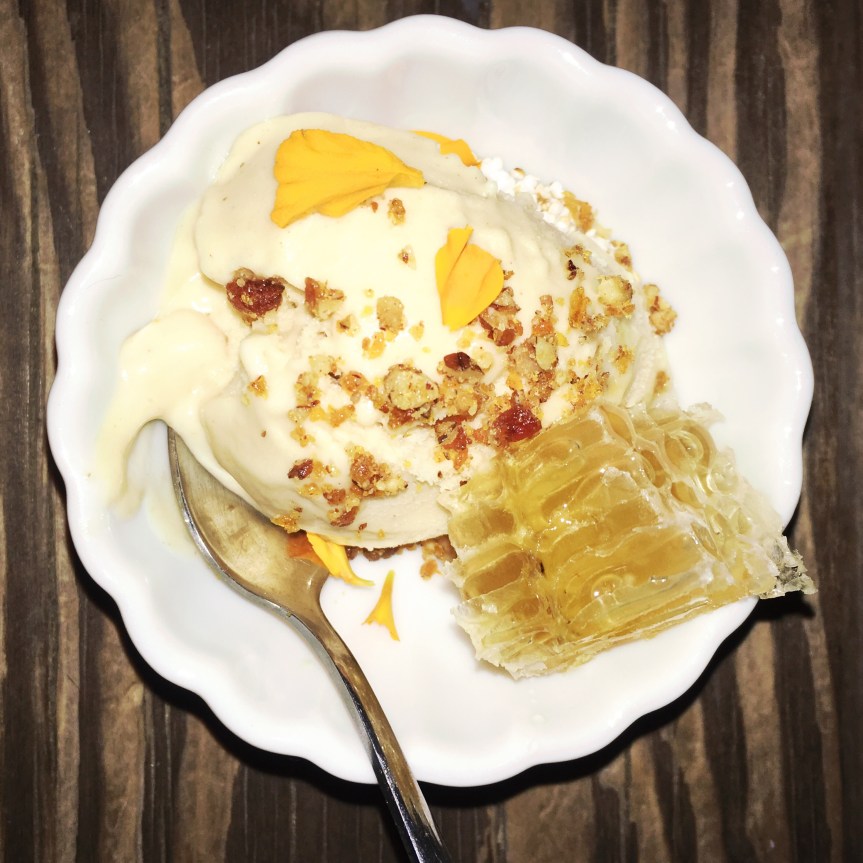 Wild Boar with a Black Onion Jam and Fresh Blackberry Jus onto a Sweet Potato Chip Root | Artist, Laura BellTo end the artfully parade of tapas, Chef Hucks prepared a Quince Gelato topped with a Acacia, Amaranth & Pecan Praline, and piece of local honey comb. Delightful! Oh so delightful! I loved everything about it!