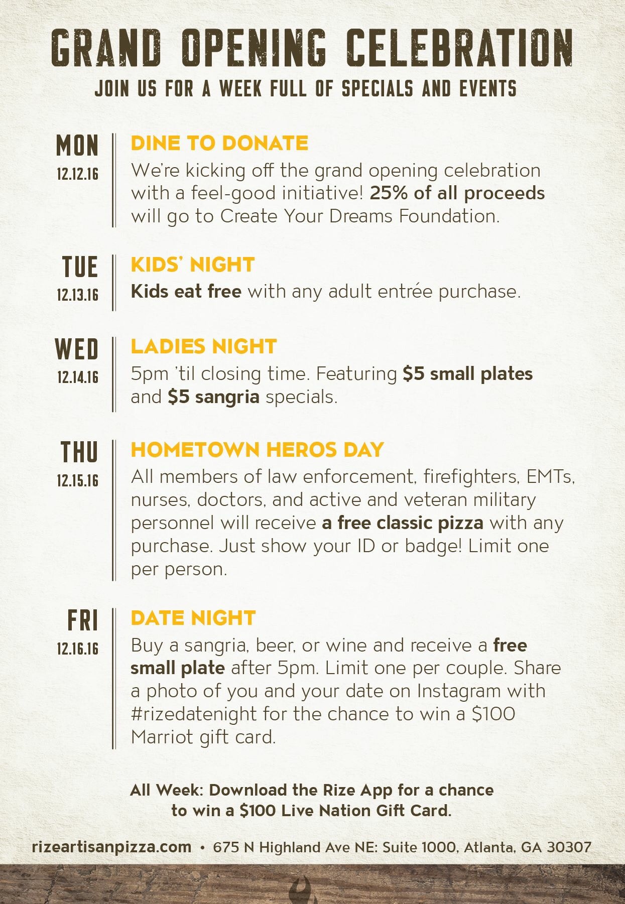 Stop by Rize Artisan Pizza + Salads next week, as they official celebrate their Grand Opening with a week of specials and events. Details below!