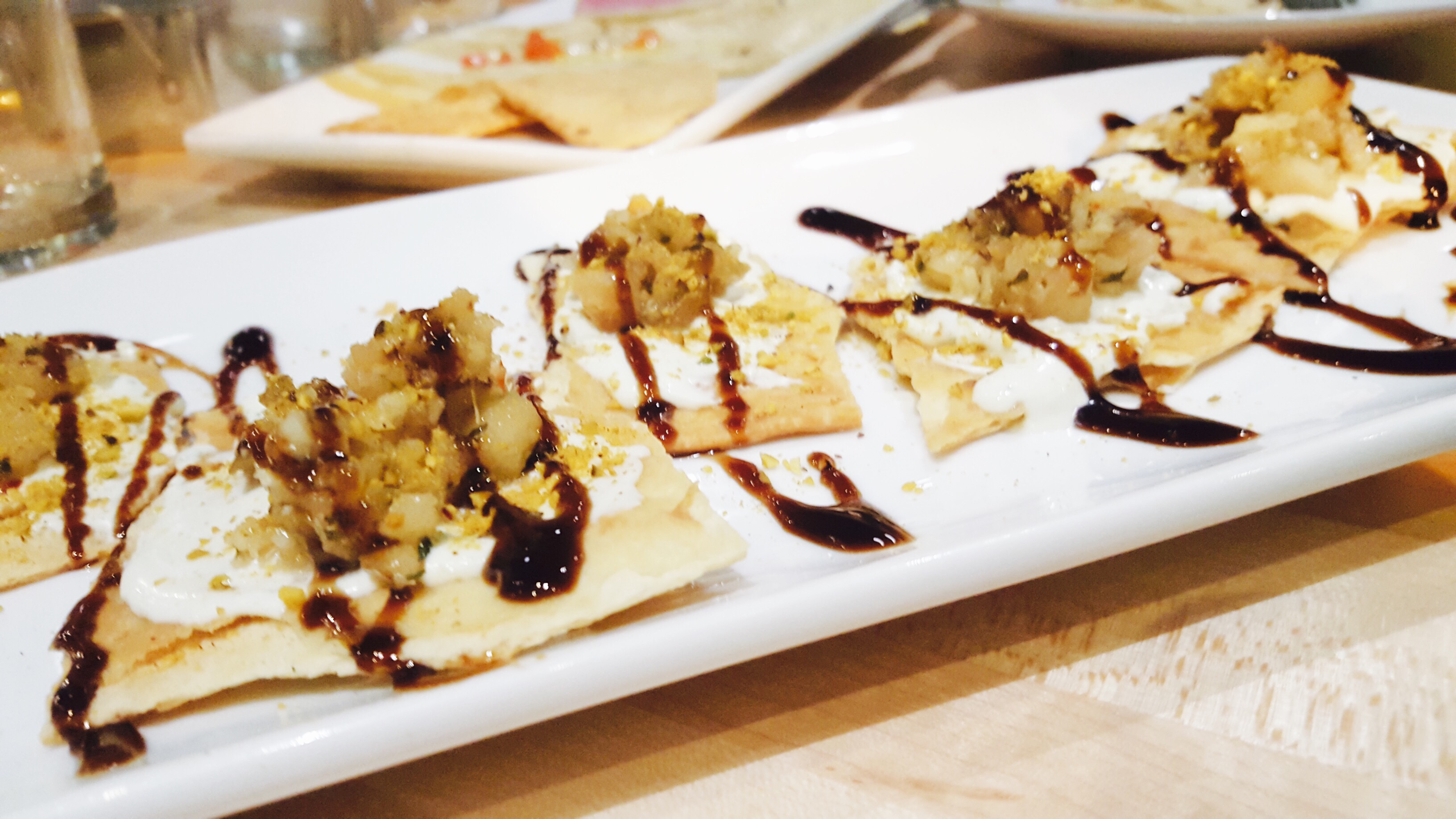 Next up, Herbed Goat Cheese Crostini, Grilled Pork Meatballs, and Stuffed Peppadew Peppers. The Herbed Goat Cheese Crostini was a unique combination of pear chutney and pistachio chili crumble on top a torn flatbread crostini finished with a balsamic reduction. I really enjoyed the complexity yet simplicity of this menu item. It was very tasty.
