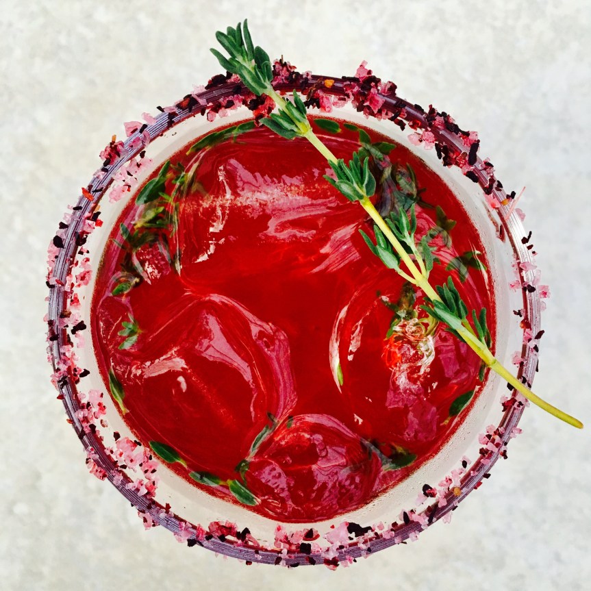 -Remove Thyme leaves from sprigs and muddle with lime juice, hibiscus simple syrup, and honey in shaker.