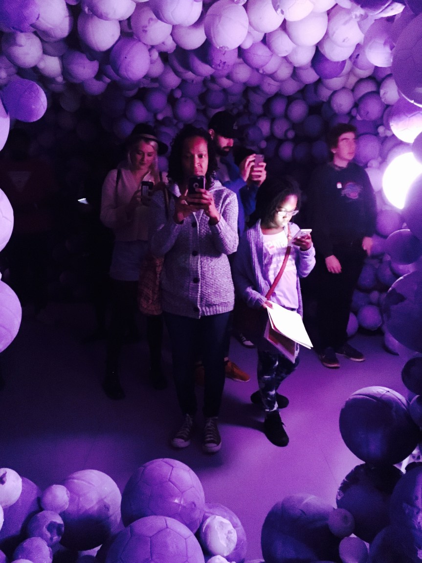 Last night museum goers at the High Museum of Art were delighted with the art of Daniel Arsham. His new exhibit Hourglass is a collection of three related installations, each infused with mythology and vibrant colors. On the second floor of the Anne Cox Chambers Wing, you will find a complete Japanese Zen garden with traditional pagoda, tatami mats, and raked sand, all rendered in bright blue. In the next gallery space art enthusiasts walk through a most unique purple amethyst cavern filled with sports balls. The final installation, located in the lobby, consists of a set of large hourglasses filled with crushed blue crystals and sculptural casts.