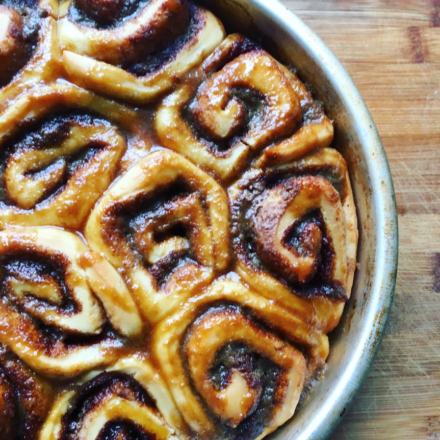 Brush butter over dough. Pour pecan butter over butter and spread evenly. Mix brown sugar and cinnamon, then sprinkle on top of pecan butter.