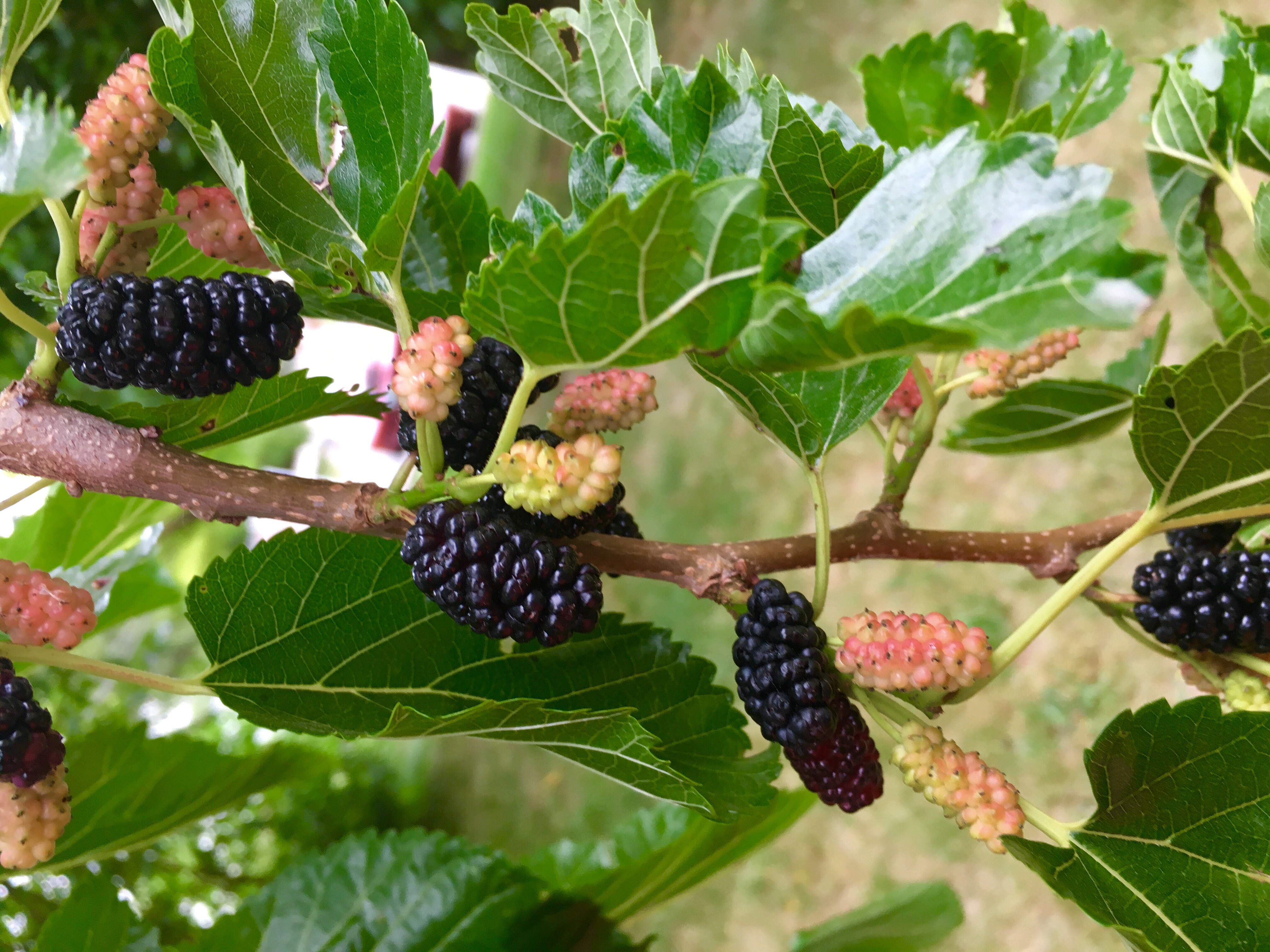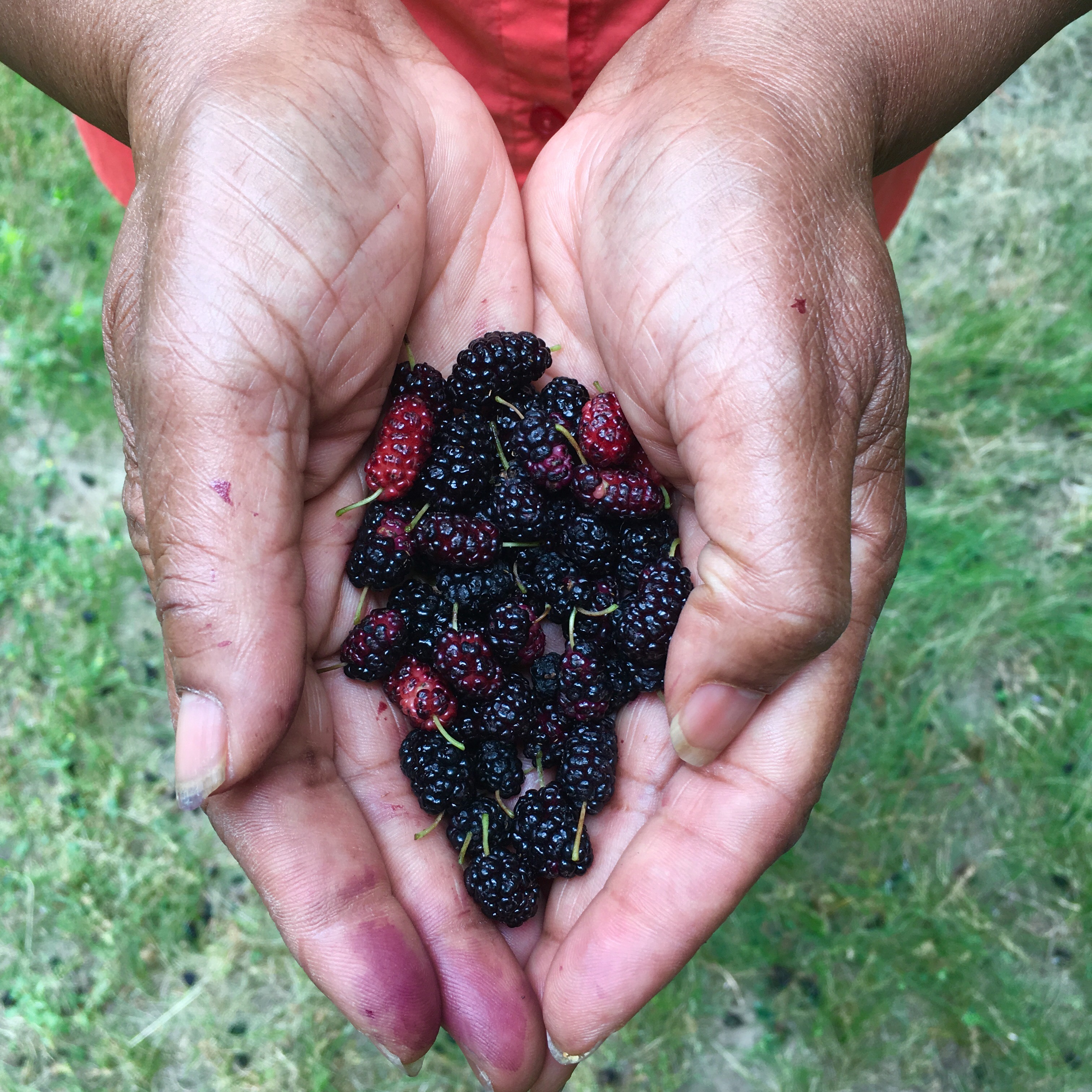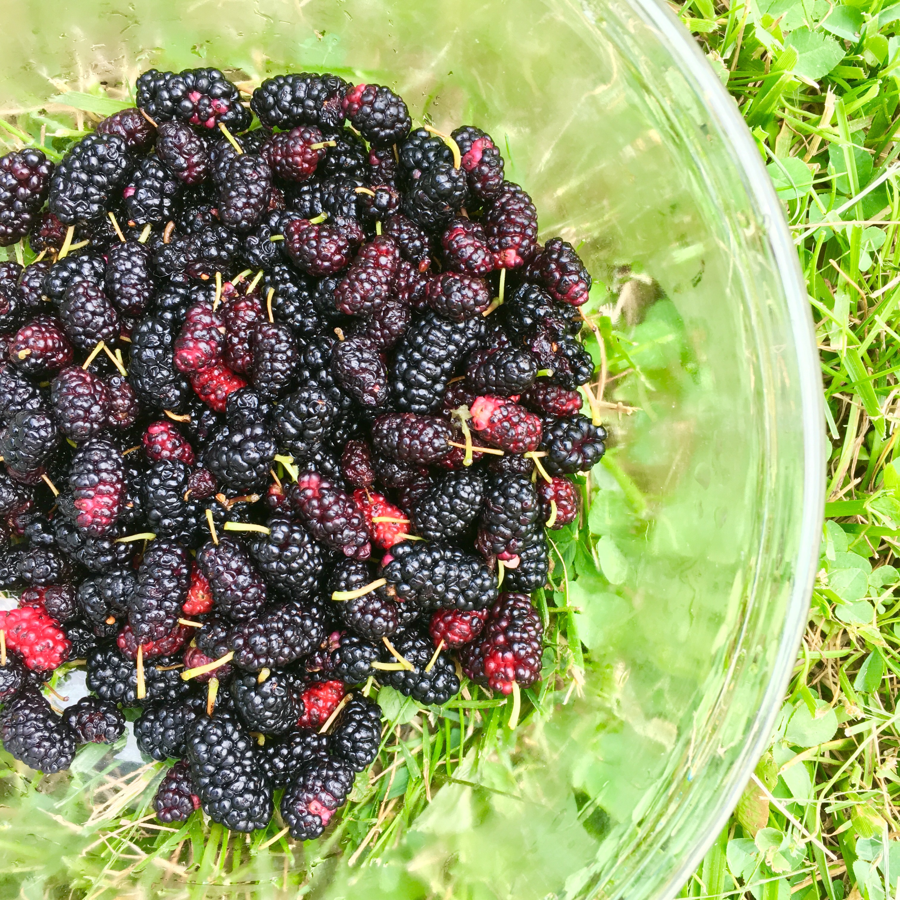 Very quickly my Mom informed me that a friend of hers had a big tree in their backyard. After one phone call and a short drive we were picking mulberries from a very abundant tree. Although tiny, these berries are packed full of flavor and nutrients.