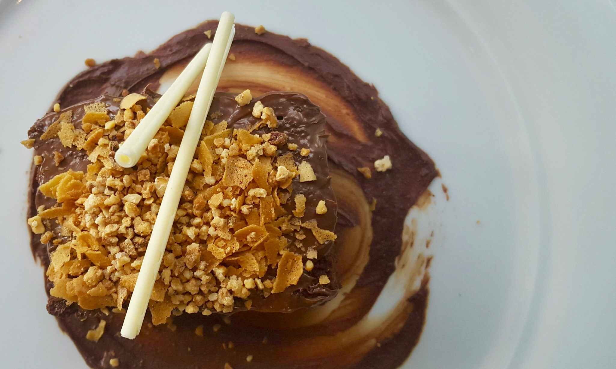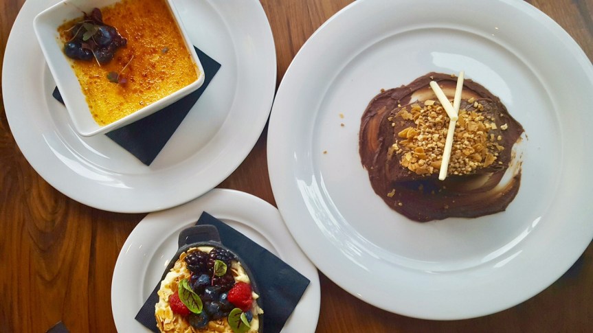 LIMONCELLO TIRAMISU ~ LADY FINGERS SOAKED IN LIMONCELLO SIMPLE SYRUP, LAYERED WITH A LEMON MASCARPONE CUSTARD, FRESH BERRIES TOPPED WITH VANILLA SALTED ALMONDSCHOCOLATE HAZELNUT FEUILLETINE CAKE ~ LAYERS OF CHOCOLATE CAKE AND HAZELNUT FEUILLETINE CREAM CHEESE ICING, ENROBED IN CHOCOLATE GANACHE AND CRUSTED WITH HAZELNUT CROQUANT-FINISHED WITH A WHITE CHOCOLATE MIKADOPINEAPPLE CREME BRULEE ~ PINEAPPLE CREME BRULEE TOPPED WITH CARAMELIZED SUGAR, BLUEBERRY COMPOTE