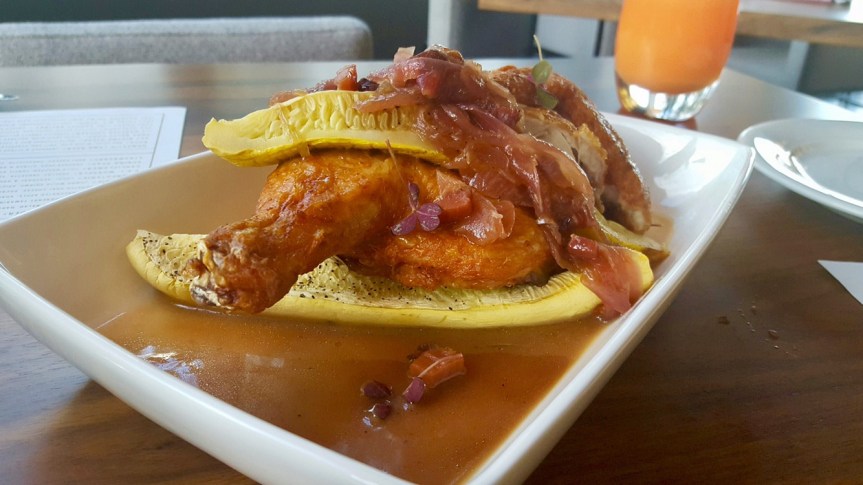 1/2 ROASTED CHICKEN PANCETTA SMOKED BUTTER, CARAMALIZED RED ONION & SUMMER SQUASHThe next chef selection was the 1/2 Roasted Chicken with Pancetta Smoked Butter, Caramelized Red Onions and Summer Squash. I loved the light crispiness of the outside of the chicken. Inside was very moist and well seasoned. On top of the chicken was some very bold caramelized red onion. They were delicious!