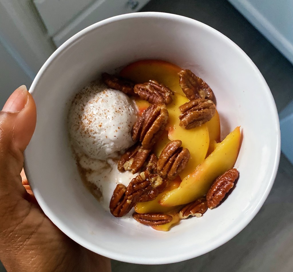 Have you ever had a taste for dessert but didn’t have time to make a whole pie or cake? It happens to me all the time! With it being peach season, I thought this Quick & Easy Peaches & Cream would hit the spot. My local farmers had a beautiful selection of Georgia peaches so I already had some on hand. This recipe calls for a tablespoon of bourbon, so I used one of my favorite bourbon brands, Woodford Reserve. If you’re not a fan of peaches, you could easily substitute them with apples or pears. The best part of this recipe is that it takes about 10 minutes to make! Enjoy!