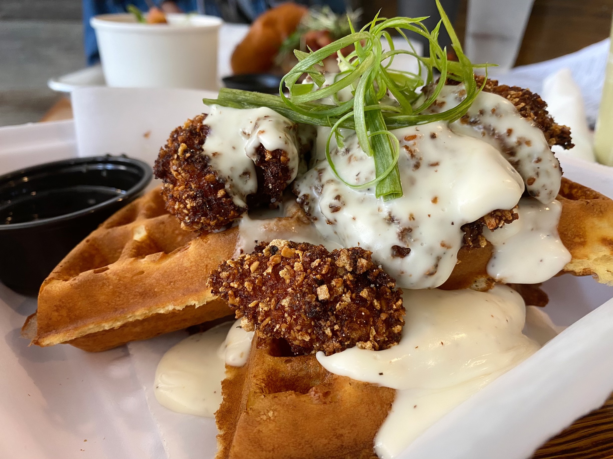 A menu item not to miss is their signature Almond Chicken and Waffles. This pile of waffles and almond crusted chicken nuggets is covered in southern black pepper gravy with a side of Ohio maple syrup for drizzling.