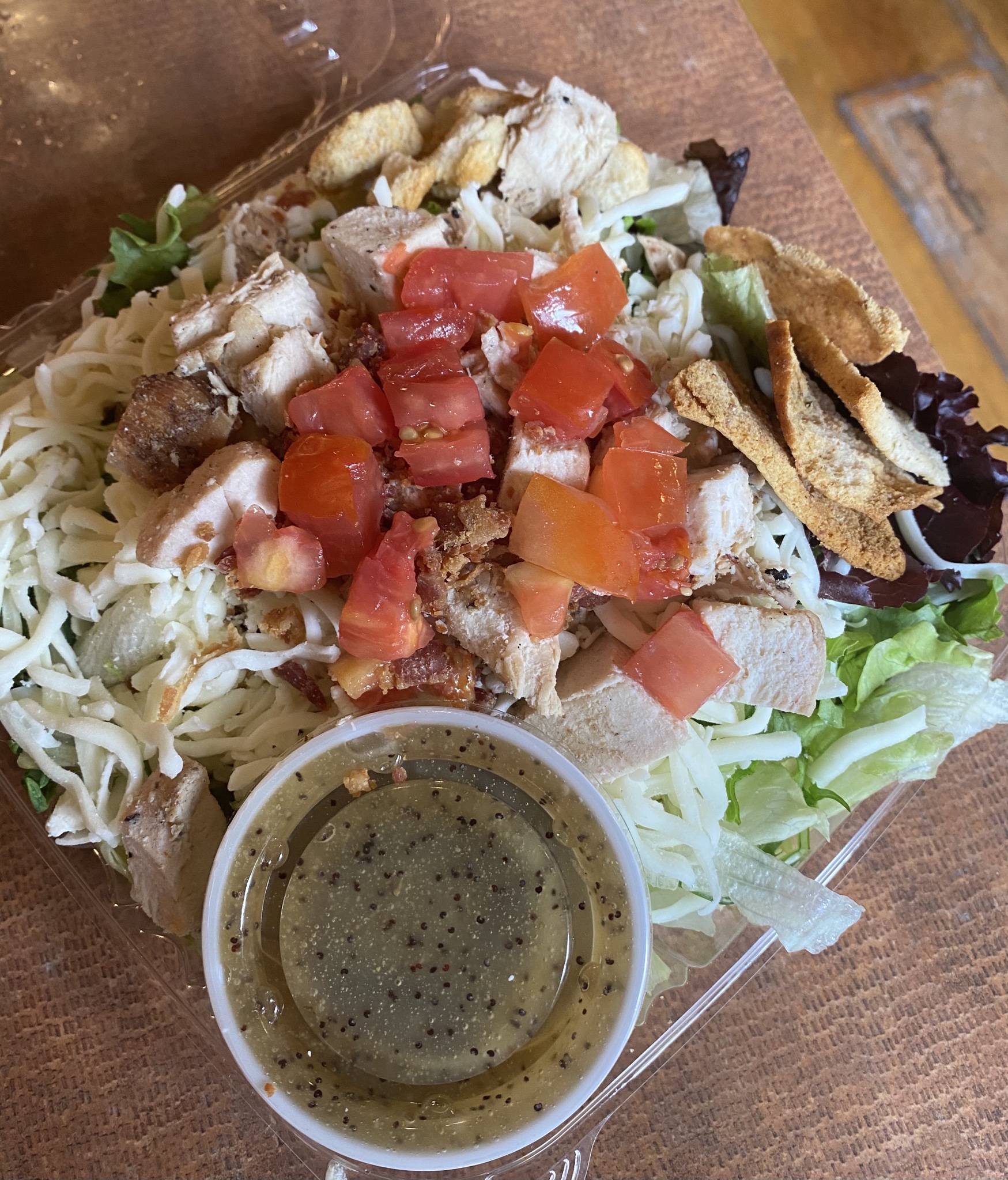 The most famous item on their menu is the Garbage Salad. This salad is huge and filled with mixed greens, onions, tomatoes, mushrooms, grilled chicken, raisins, and three kinds of cheese (provolone, mozzarella, and feta) dressed with poppy seed dressing, homemade croutons, house-made pita crisps, and real bacon bits. It’s a whole experience!