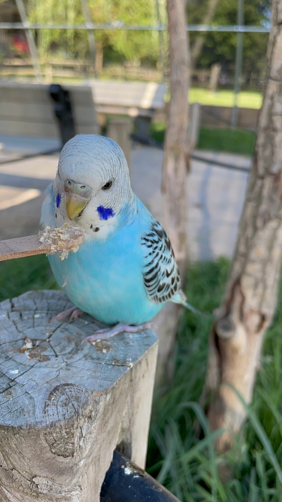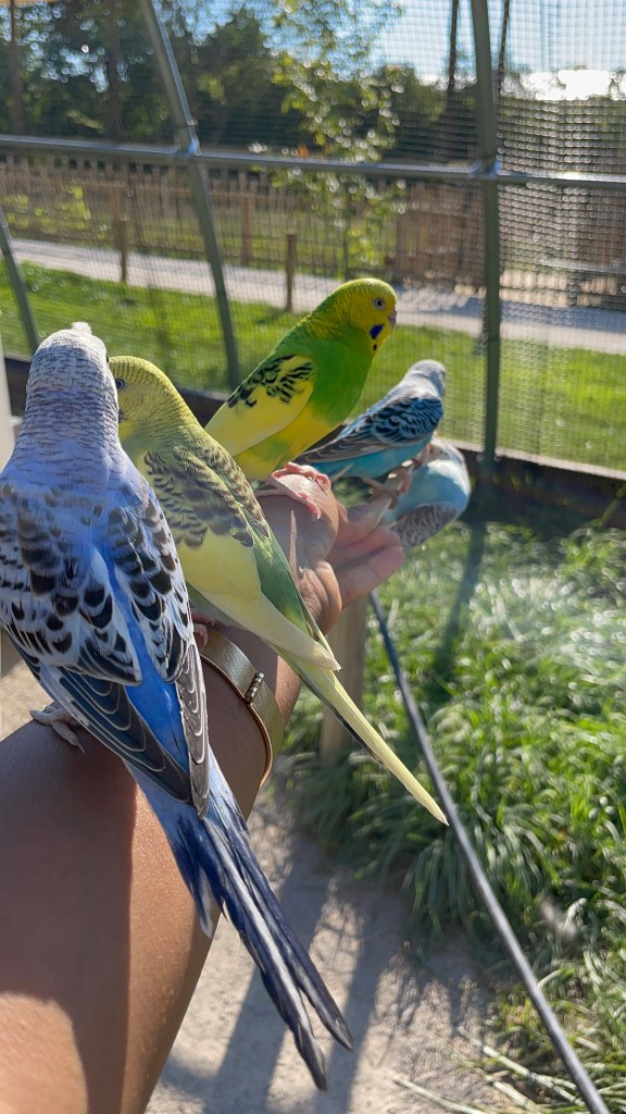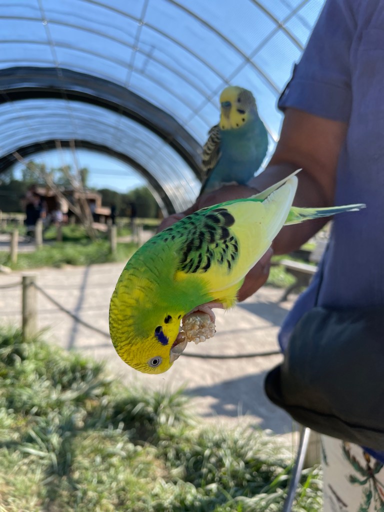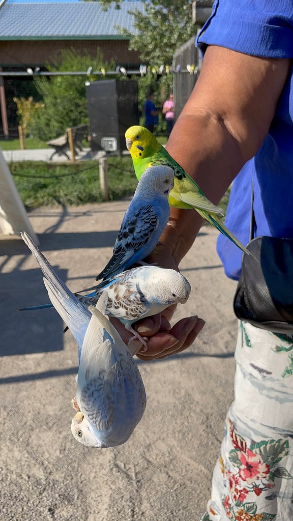 After the drive thru safari we decided to take a quick stroll through the walk thru safari. This trail featured additional exotic animals to interact with. There were opportunities for camel rides and feeding an African Spurred Tortoise. We decided to check out their new Aviary Adventure where you can feed over 400+ budgies! After purchasing seed sticks you enter the walk in birdcage. If you the seed stick out the birds are immediately coming for it! Lol! The birds were quite social and would just land on your head. At one point I had a line of birds on my arm. I guess they thought I was a tree. Lol! That was fun!