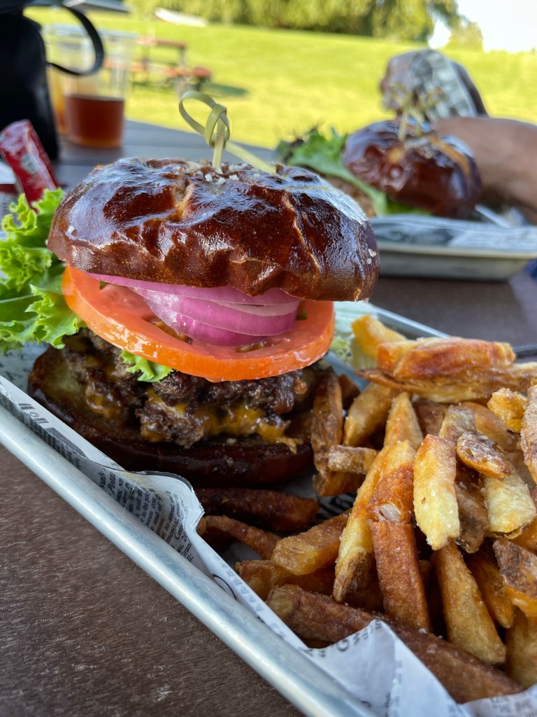 The food arrived in a very timely fashion. The burgers were hot and ready to be devoured. What a delicious burger! It was everything! The burger was perfectly seasoned, the bun was nicely toasted and soft to touch. The fries were great too! Tens all around! It was the perfect situation great food, great beer, and a beautiful setting to enjoy it in.