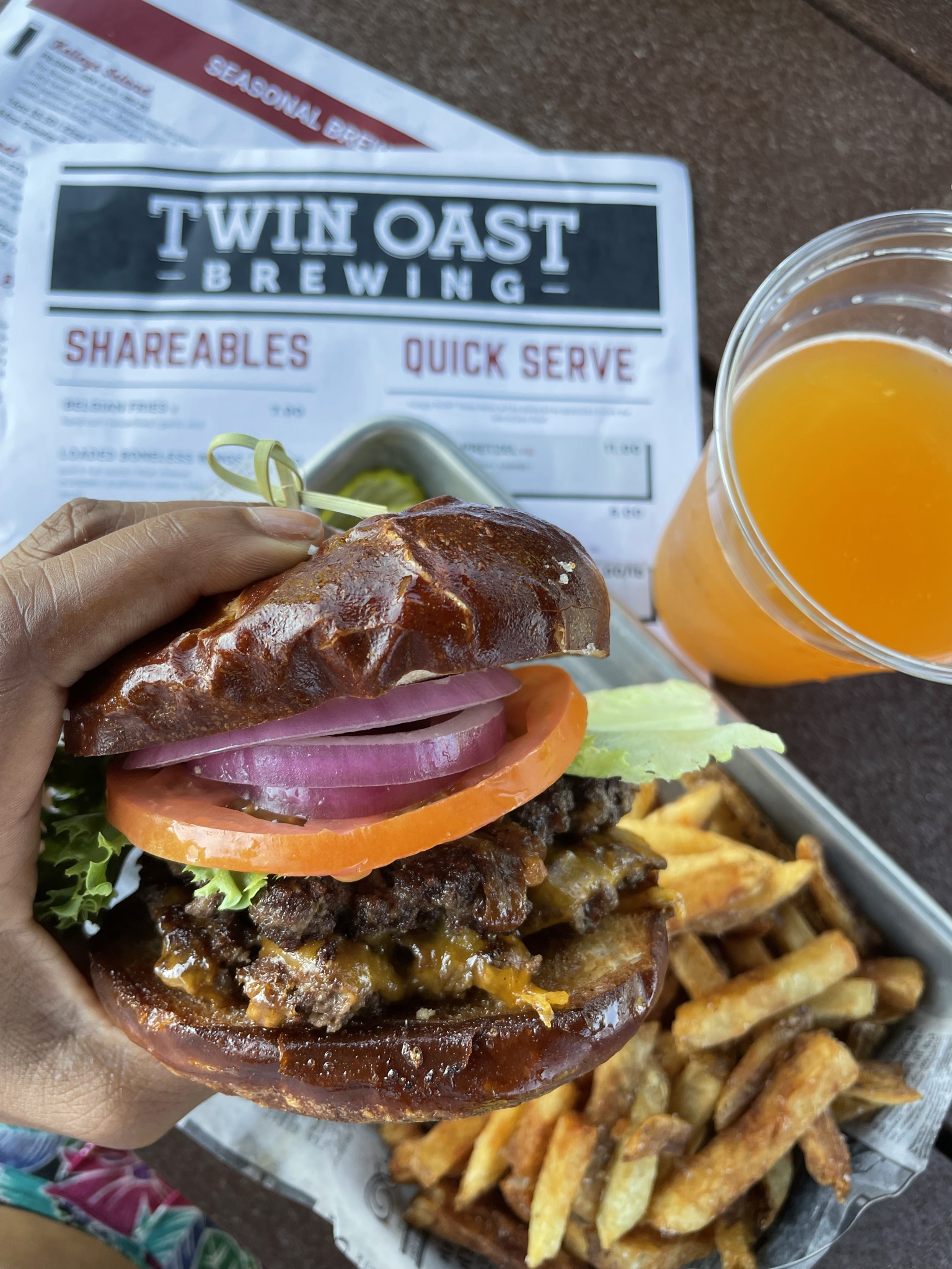 The menu was full of delicious items. Mom and I both ordered the Twin Oast Burger. A smash burger blend with sharp cheddar, caramelized onions, pub sauce, on a salted pretzel bun. I had mines with the Belgium fries, while Mom opted for the side salad. While we wait I went to retrieve drinks. I decided on one of their seasonal beers, the Apricatawba, an apricot ale. It was so good I bought a 4 pack to go!