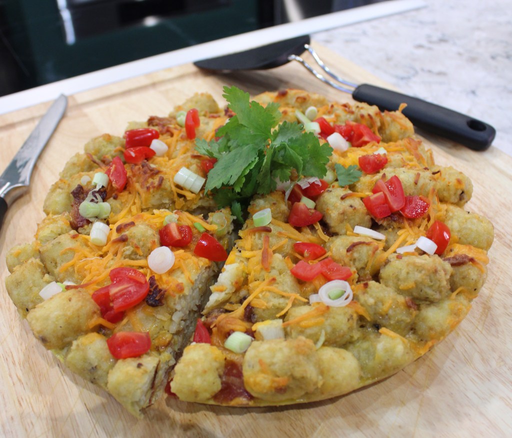 Tater Tot Frittata with Chopped Salad: This recipe is a hearty and delicious breakfast or brunch dish that features crispy tater tots, fluffy eggs, cheese, bacon, and green onions baked in a skillet and served with a fresh chopped salad. It takes about 45 minutes to make and serves 6 to 8 people.