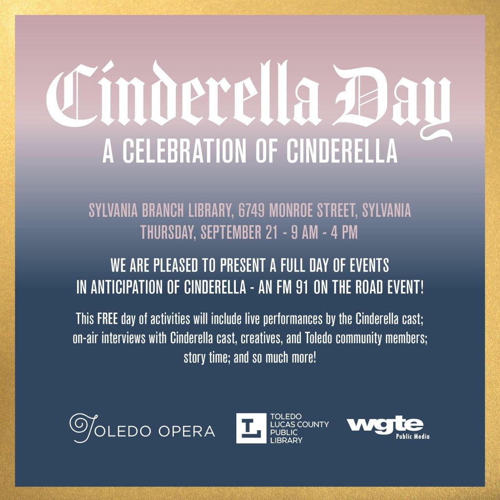Toledo Opera has partnered with Toledo Lucas County Public Library and media partner WGTE Public Media to present a full day of free events in anticipation of Toledo Opera’s upcoming production of Cinderella on Thursday, September 21 from 9:00 a.m. until 4:30 p.m. at Sylvania Branch Library located at 6749 Monroe Street, Sylvania, OH 43560.