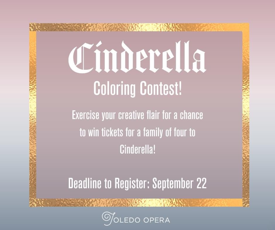 Don’t forget to register and submit your coloring pages for our Cinderella Coloring Contest! This contest is open to all ages and features 3 age divisions! The deadline to submit is September 22! Learn more at https://www.toledoopera.org/beyond-the-stage/cinderella-coloring-contest/https://www.toledoopera.org/beyond-the-stage/cinderella-coloring-contest/
