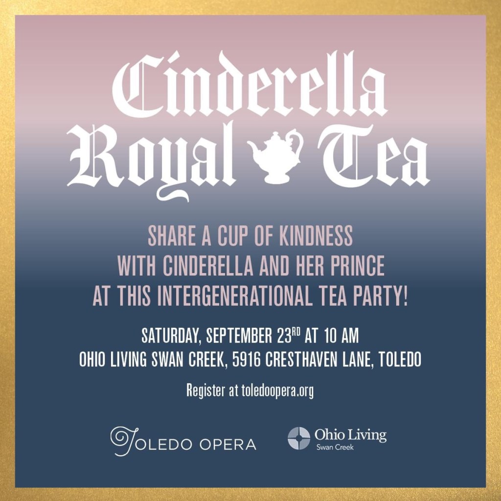 Toledo Opera is has joined forces with Ohio Living Swan Creek to hold a RoyalTea in celebration of Cinderella! This inter-generational tea party will feature delicious food, crafts, prizes, a meet-and-greet with Cinderella & her Prince, and so much more! The RoyalTea will be held at Ohio Living Swan Creek on Saturday, September 23rd at 10 AM. Space is limited, so purchase your tickets now! Visit toledoopera.org today!