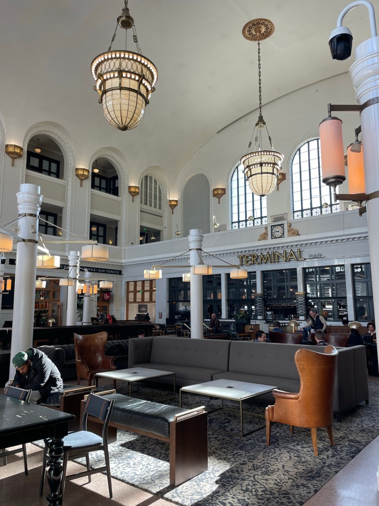 Upon reaching Union Station, I found a delightful array of amenities – a coffee shop, breakfast spot, cocktail bar, bookstore, and an Italian restaurant. Naturally, my first stop was the Pigtrain Coffee Company, where I savored a delicious seasonal latte. A Vanilla Biscotti Latte made with vanilla, lemon, almond milk, and star anise. So good!