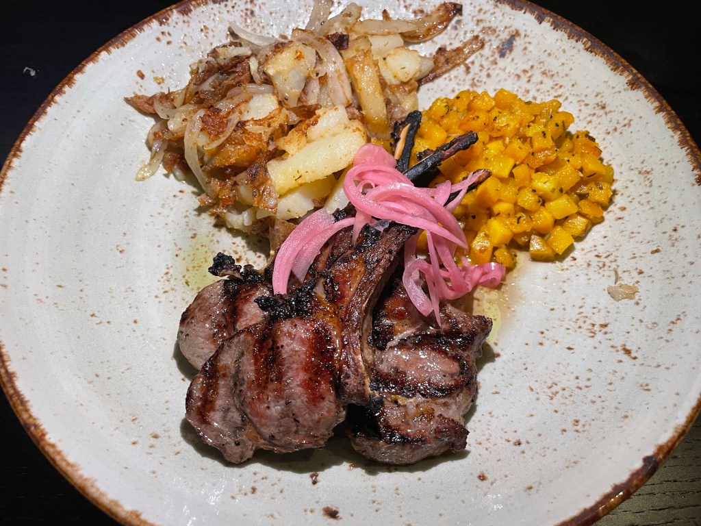 PISTACHIO CRUSTED LAMB CHOPS | Lyonnaise Potatoes, Pickled Red Onion, Seasonal Vegetable